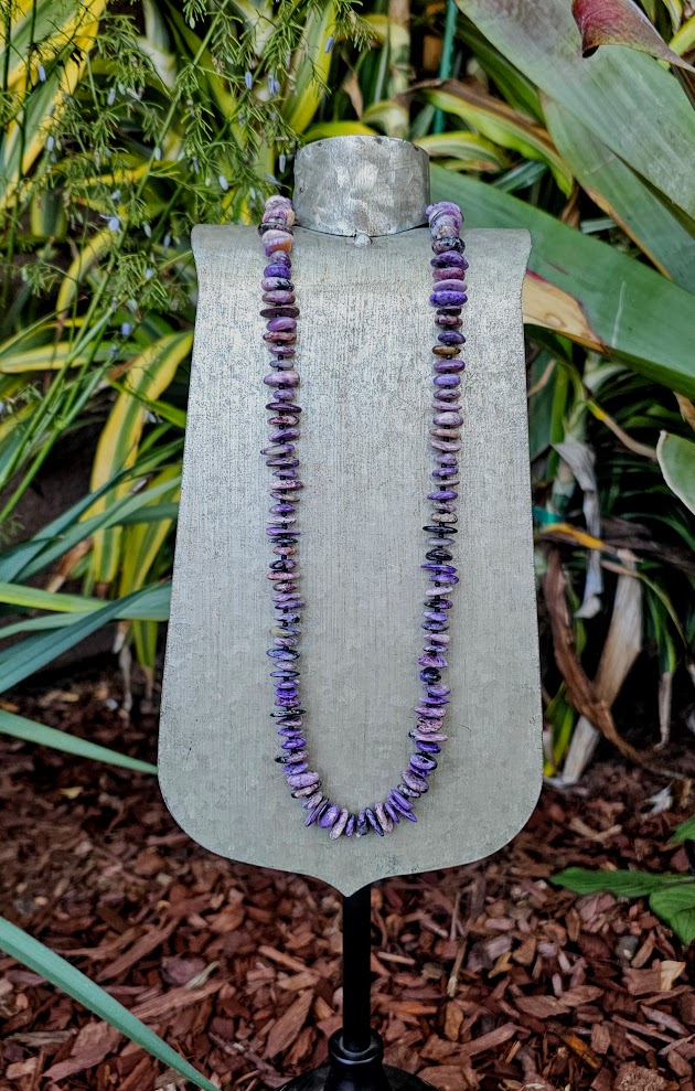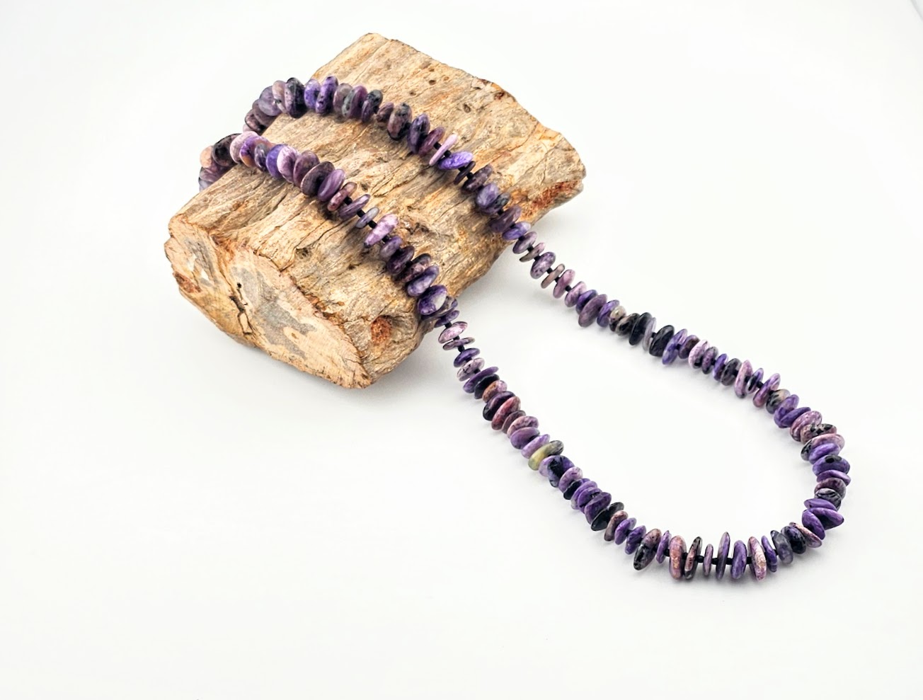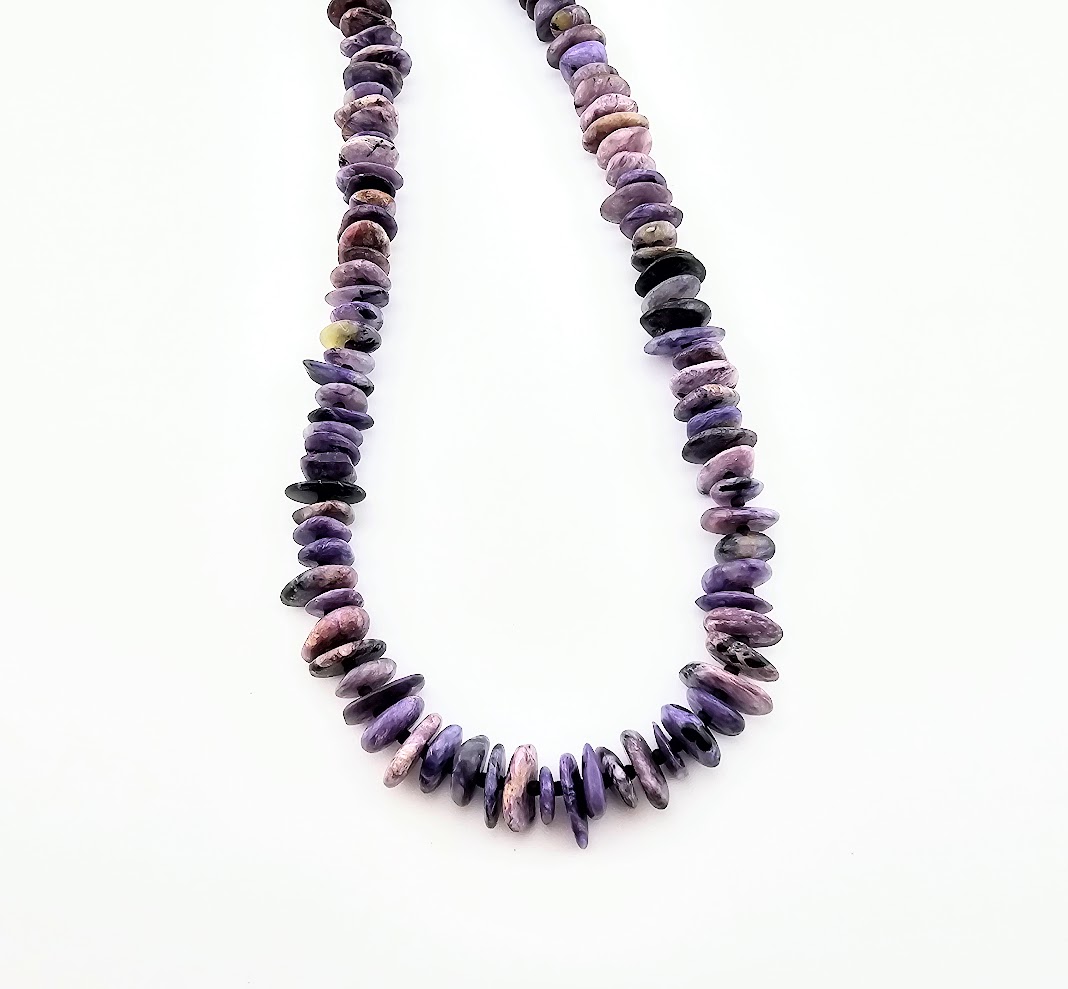 Each piece is photographed up close to highlight its textures and details. I strive to show colors as accurately as possible, but colors may vary slightly due to screen settings and individual perception. Charoite naturally varies in tone and pattern, so each necklace has its own unique character.