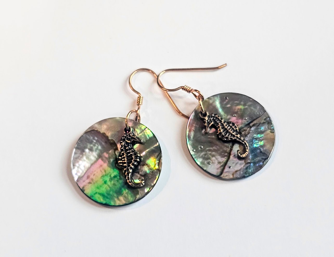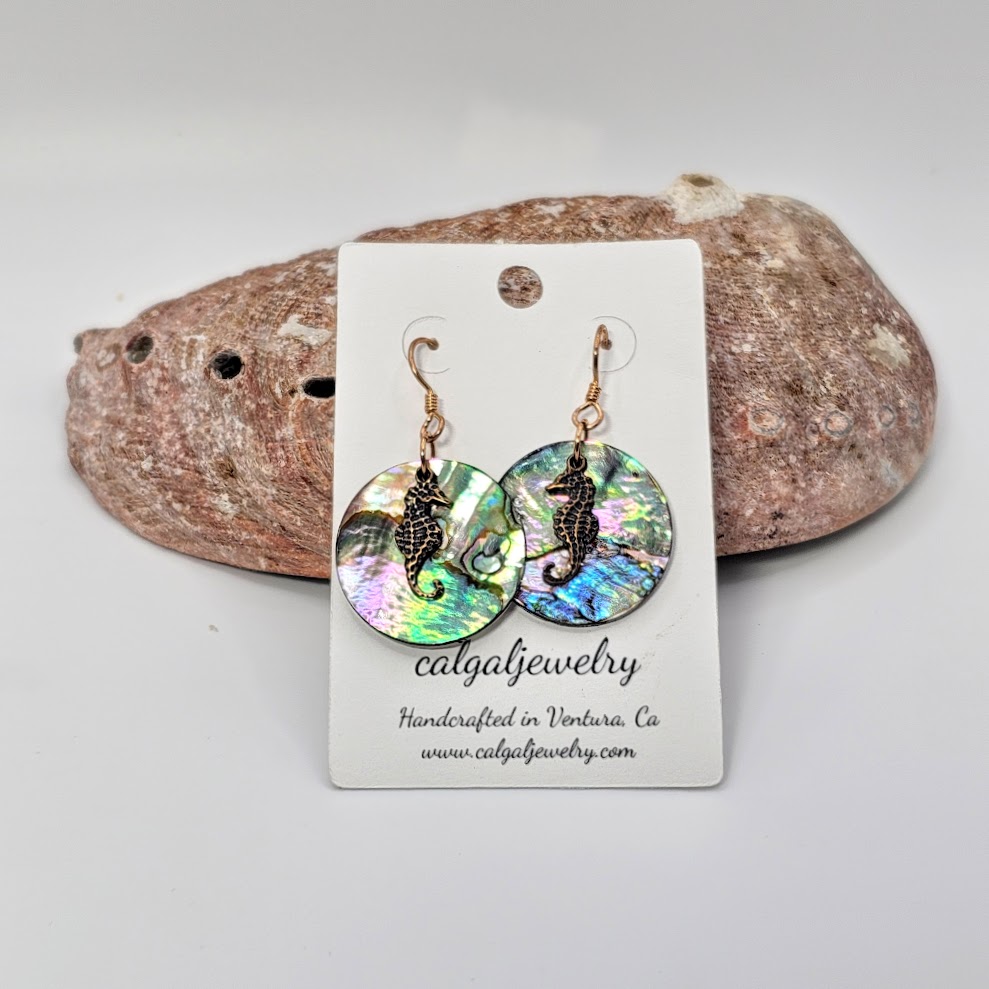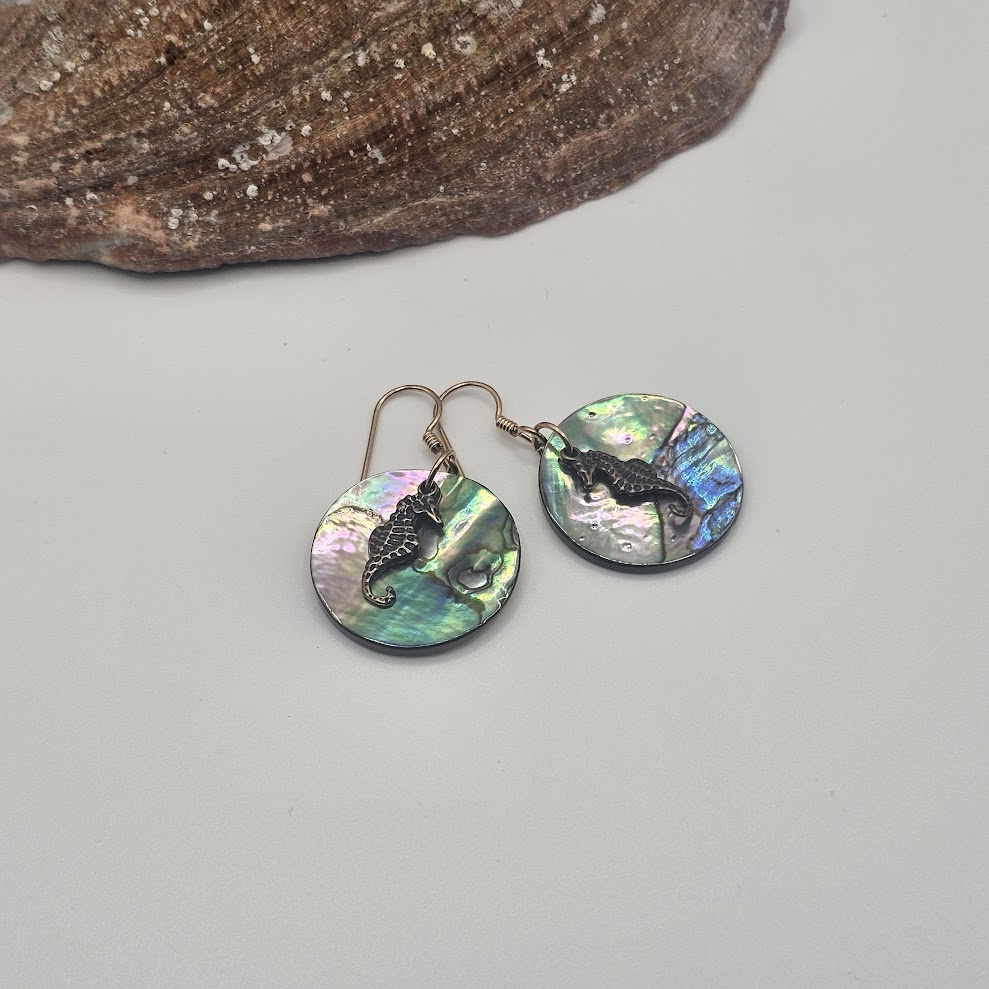 These abalone shell earrings feature solid bronze seahorse layered over luminous 25mm shell coins, creating effortless boho beach style. Inspired by the coast and handcrafted in small batches, they’re lightweight statement dangles perfect for ocean lovers and free spirits alike.
